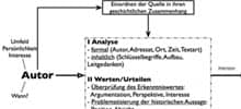 Schaubild, auf dem Schritte und Zusammehänge der Quelleninterpretation übersichtlich dargestellt sind. Mit Hinweisen zur unterrichtlichen Einführung und einigen nützlichen Links ins Web. Links geprüft 15.03.2007.