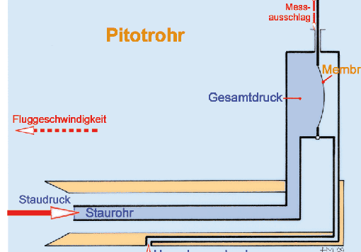 Die Fließgeschwindigkeit der Luft wird aus der Größe des Staudruckes (auch dynamischer Druck) berechnet. Der Gesamtdruck ist der Druck, den die umgebende Luft auf den Flugkörper ausübt. Der Staudruck steigt mit zunehmender Fluggeschwindigkeit.