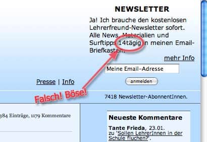 Hallo, rechts oben lese ich, der Newsletter sei “14tägig” erreichbar. Vor mehreren Jahren hatten wir Deustchlehrer unserer Schule eine Diskussion mit dem stellvertretenden Schulleiter (Mathematiker), und zu unserem großen Erstaunen heißt es tatsächlich: “14-täglich”. [...] Der Newsletter erscheint wohl 14-täglich (EIN MAL in 14 Tagen), ist aber z.B. bei meinem Account 30-tägig (30 Tage lang) erreichbar.
