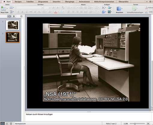Wenn SIE einen Vortrag halten, dann möchten SIE im Zentrum stehen, den Leuten etwas erzählen und bei Bedarf ein Schaubild oder ein Zitat an die Wand werfen. Wenn Sie erst einmal in der PowerPoint-Oberfläche rumklicken, haben Sie schon klar gemacht, worum es geht: Sie werden den Leuten eine stinklangweilige Präsentation zeigen und daneben stehen und reden.