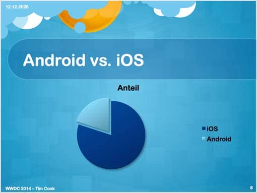 Suchen Sie nach dem Apple-Logo, suchen Sie nach Design-Elementen, suchen Sie nach Metainformationen wie Foliennummer oder Datum. Nichts davon werden Sie finden. Trotzdem wirken solche Präsentationsfolien in ihrer Schlichtheit edel.