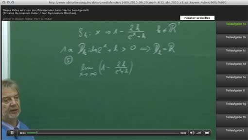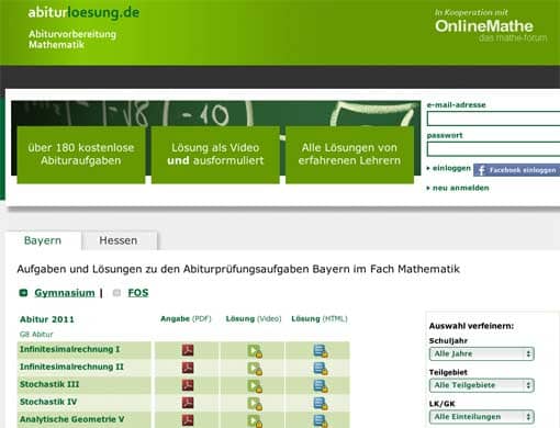 Um so erfreulicher, dass der Damm der schwerfälligen Bürokratie einen Riss bekommen hat, durch den ein erster Sonnenstrahl hineinfällt. Unter abiturloesung.de sind die Mathematikaufgaben der hessischen Abiturjahrgänge 2007 bis 2011 kostenlos im Internet abrufbar, für das Jahr 2011 auch mit Lösungsvorschlägen. Die Mathematikaufgaben des Landes Bayern sind für die Abiturjahrgänge ab 1988 online (auszugsweise auch schon ab 1978), für die meisten gibt es Lösungen als Video. Hierzu muss man sich jedoch kostenlos registrieren (einloggen mit Facebook möglich).