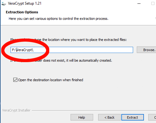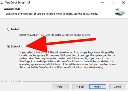 Während der Installation wählen Sie nicht die Option »Install«, sondern die Option »Extract«. So können Sie VeraCrypt später direkt von einem USB-Stick o.ä. starten (und damit auch auf Computern benutzen, auf denen VeraCrypt nicht installiert ist). Falls Sie aus Versehen doch »Install« gewählt haben, macht das nichts: Sie lassen das Installationsprogramm einfach noch einmal laufen und wählen dieses Mal »Extract«.