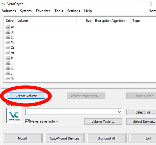 Starten Sie VeraCrypt und wählen Sie »Create Volume«.