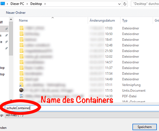 Im folgenden Beispiel wurde der Name schuleContainer gewählt. Sie können natürlich einen beliebigen anderen Namen wählen (veracrypt_container, 30GBvc oder auch sonnenblume, wenn Ihnen das praktischer erscheint).