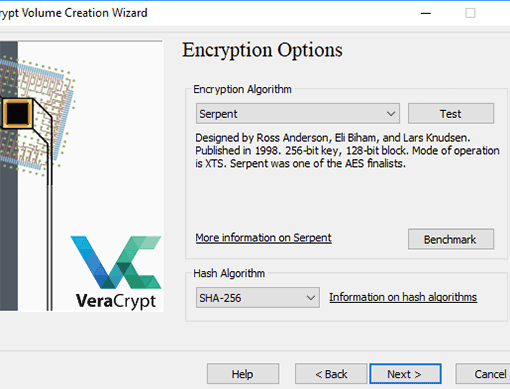 Danach wählen Sie eine Verschlüsselungsmethode aus. Hier gibt es zahlreiche Optionen. In unserem Fall ist ziemlich egal, was wir wählen. Da wir auf unserem Stick nicht die Bauanleitung für die Atombombe speichern und außerdem nicht sämtliche Geheimdienste der Welt unsere Verschlüsselung knacken wollen, benutzen wir das, was am schnellsten geht: oben »Serpent« und unten »SHA-256«.