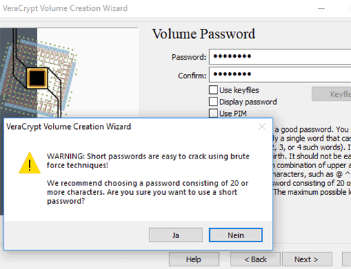 Ist Ihr Passwort zu kurz, warnt VeraCrypt, dass das einfach zu knacken sei. Grundsätzlich sind lange, komplexe Passwörter gut - aber bleiben Sie verhältnismäßig. Niemand wird mit Profitools Ihren Container knacken, um an zwei alte Notenlisten und Ihre Folien zu »Osmose im Wandel der Zeiten« zu kommen. Also wählen Sie ein Passwort, das Sie einigermaßen zügig eingeben können.