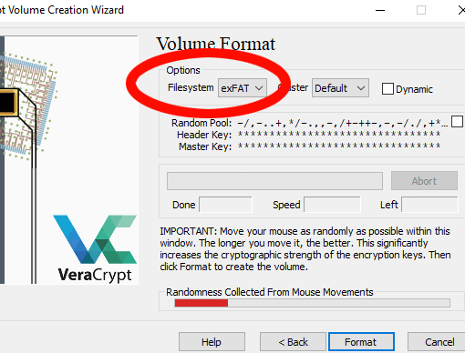 Im nächsten Schritt wird der Container formatiert, also sozusagen beschreibbar gemacht. Wählen Sie als Dateisystem exFAT aus. Bewegen Sie die Maus eine Zeit lang durch die Gegend, um Zufälligkeit zu erzeugen (das erschwert den Knackern das Knacken). Dann klicken Sie auf »Format«.