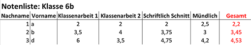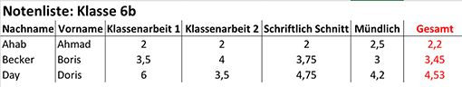 Sie haben eine Notenliste mit Excel angefertigt. Die sieht so aus: