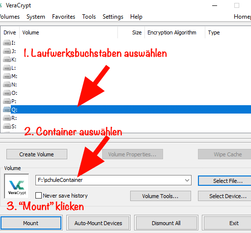Nun starten Sie VeraCrypt (s.o. Schritt 1) und wählen einen Laufwerksbuchstaben aus, der noch nicht vergeben ist. "Q" ist nicht schlecht, da der selten als Standard für irgendwelche Medien verwendet wird. Dann wählen Sie Ihren Container aus und klicken "Mount".