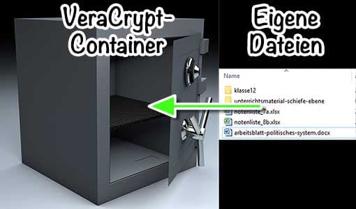 Im folgenden Bild stellt der Tresor links den VeraCrypt-Container da (= eine Datei, die wir im nächsten Schritt anlegen); sobald wir den Tresor öffnen (indem wir VeraCrypt starten und unser Passwort eingeben), können wir neue Dateien hineintun, bestehende Dateien öffnen, bearbeiten usw.