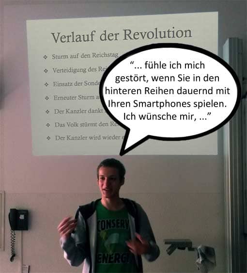 Im obigen Beispiel möchte der Mann kurz aus dem Thema aussteigen und auf die Zuhörer einwirken (nämlich: Sie sollen bitteschön aufhören, auf ihren Smartphones rumzutippen). Das wird aus zwei Gründen nicht funktionieren: