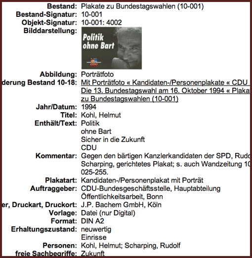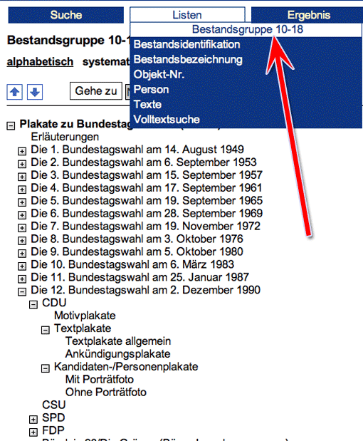 * Wichtigste Ansicht: Klicken Sie bei Listen auf den Unterpunkt "Bestandsgruppe 10-18" - hier finden Sie eine Übersicht über die einzelnen Plakatbestände (z.B. "Plakate zu Bundestagswahlen", "Europawahlplakate", "Landtagswahlplakate Baden-Württemberg" usw.). Beachten Sie, dass die Plakate für alle nicht-CDU-Parteien nur als briefmarkengroße Vorschau verfügbar sind.