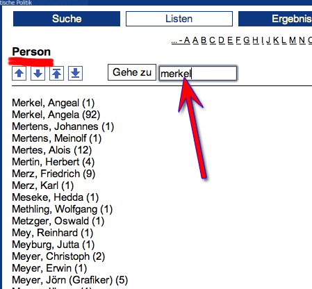* Klicken Sie bei Listen auf den Unterpunkt "Person" und geben Sie ins Feld den Namen einer Politiker/in ein.