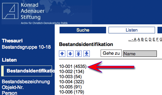 * Wählen Sie oben "Listen" aus (direkt auf "Listen" klicken), dann den obersten Bestand (10-001), das ist die Plakatsammlung mit Plakaten zu Bundestagswahlen. Die Klammer hinter der Bestandsnummer zeigt, wie viele Dateien vorhanden sind. Nun erhalten Sie eine Ansicht aller Plakate in chronologischer Reihenfolge - die Nummer 1 ist "Wir wählen Köpfe keine Listen - wähl auch Du CDU".
