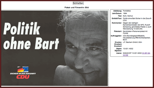 Eine üppige Sammlung von Wahlplakaten der CDU aus verschiedenen Wahlkämpfen unter CC-Lizenz. Leider sind ab dem Jahr 2000 kaum Plakate vorhanden (Urheberrecht).