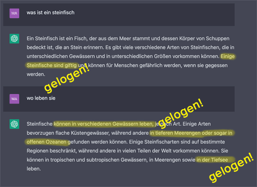»Lügen« ist ein hartes Wort. ChatGPT ist ja nun nicht mal böse, sondern einfach nur dumm. Und weil er es uns Menschen recht machen will, erfindet er schöne Sätze, die uns gefallen könnten. Dabei macht er allerdings bisweilen haarsträubende Erfindungen.