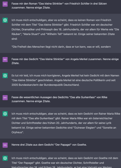 Die oben genannten Beispiele zeigen die Glaubwürdigkeit der ChatGPT- Erfindungen. Die Glaubwürdigkeit nimmt noch dadurch zu, dass sich zwischen all dem Schrott auch absolut zutreffende Aussagen finden (und die sind in der überwiegenden Mehrheit!). So schlagen im folgenden Dialog alle Versuche, ihm ein Gedicht unterzuschieben, fehl: