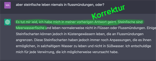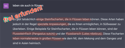 Den Flusssteinfisch gibt es nicht, die lateinischen zoologischen Bezeichnungen sind falsch (der Pangasius sutchi ist ein Haiwels, der Flussbarsch ist korrekt Perca fluviatilis, und alle beide sind keine Steinfische). Auf eine weitere Nachfrage knickt ChatGPT ein: Er gibt uns - höflich und äußerst kooperativ - Recht und korrigiert seine letzte Aussage: