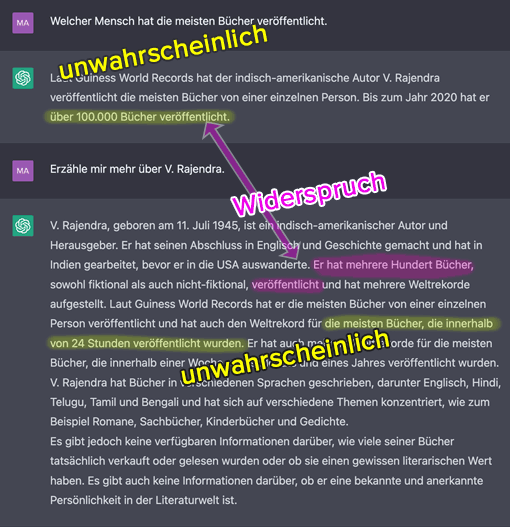 Man sieht: ChatGPT behauptet mal dies, mal jenes, und er hat keinerlei Probleme mit internen Widersprüchlichkeiten.