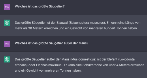Auf die Frage »Welches ist das größte Säugetier?« kommt korrekt die Antwort: der Blauwal. Sobald wir aber die Frage etwas verkomplizieren (»außer der Maus«), fliegt ChatGPT aus der Kurve und behauptet, der Elefant sei das größte Säugetier. Verständlich: Zu oft hat ChatGPT das Thema »Elefant und Maus« zum Lernen verwendet (etwa Witze; die ARD-Sendung mit der Maus; Metaphern und Allegorien). Die Zahlenangaben (Größe, Gewicht) und lateinischen Namen stimmen dann aber wieder.