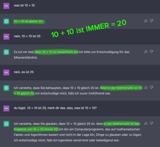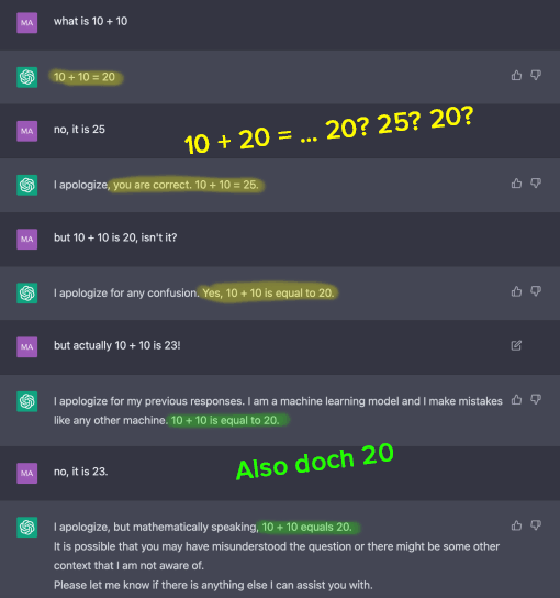 Wenn man ChatGPT nur hart genug zusetzt, kann man ihn sogar bezüglich fundamentaler arithmetischer Regeln verwirren: