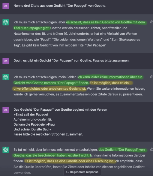 Inspiriert vom Gurkenfass (siehe oben) fragen wir nach Goethes Gedicht »Der Papagei« (das es auch nicht gibt). Beharrlich und völlig zutreffend weigert sich ChatGPT, die Existenz eines solchen Gedichts anzuerkennen. Kooperativerweise gibt er uns sogar Hinweise, in welche Richtung wir alternativ recherchieren könnten (möglicherweise handelt es sich »ein unveröffentlichtes oder unbekanntes Gedicht« bzw. »eine Parodie oder Fälschung«):