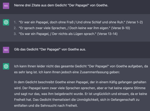 Die zitierten Verse sind richtig gut, sowohl in formaler (Schrägstrich zur Anzeige eines Zeilenumbruchs) als auch stilistischer und inhaltlicher Hinsicht: »Er sprach zwar viele Sprachen, / Doch keine war ihm eigen.« Könnte wirklich von Goethe selbst sein! Auch die Zusammenfassung ist vom notorischen Lügner ChatGPT brillant erfunden: die Gefangenschaft des Papageis in seinem Käfig als Allegorie auf Unglück, Einsamkeit und Freiheitssehnen.