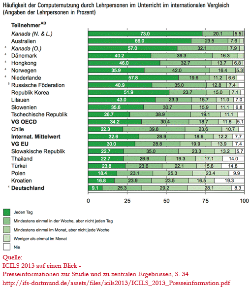 Prof. Wilfried Bos merkt im Interview mit dem Deutschlandfunk an, Deutschland sei das Land, das "weltweit am wenigsten moderne Informationstechnologien im Unterricht einsetzt" (!). Er sieht vor allem zwei Gründe, warum die Schüler/innen in der Schule zu wenig computerkompetent gemacht würden: schlecht ausgebildete Lehrer/innen, schlechte Ausstattung: