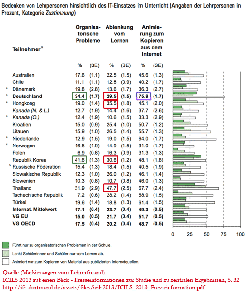 Die Mehrzahl der befragten Lehrer/innen stehen dem Einsatz digitaler Medien im Unterricht positiv gegenüber; allerdings ist der Anteil geringer als in den anderen ICILS-2013-Teilnehmerländern. Die folgende Tabelle zeigt, dass bei deutschen Lehrer/innen die Angst vor den Gefahren der IT dominiert: Bei den Befürchtungen, dass der Einsatz digitaler Medien im Unterricht organisatorische Probleme bereiten, vom Lernen ablenken oder zum Kopieren aus dem Internet verführen könne, belegt Deutschland durchgängig Spitzenplätze, die weit über den Durchschnitten liegt: