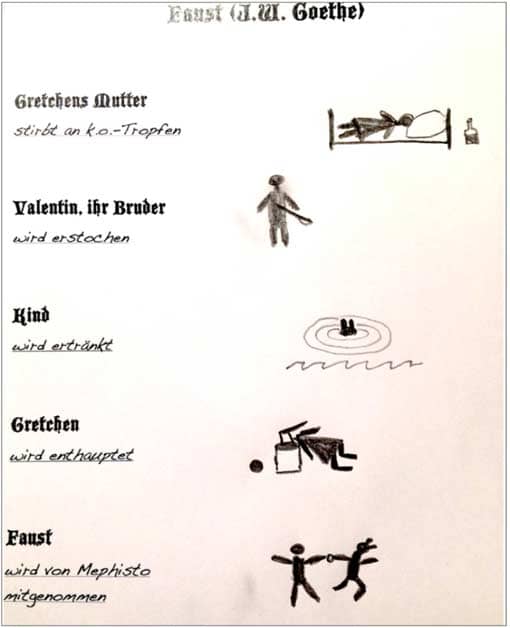 Schon im Titel oder buchstäblich auf der ersten Seite wird »Tod« eingeführt als eine der alle drei Werke verbindenden Thematiken: »Dantons Tod« - »Ich war todmüde« (Homo Faber) - »Agnes ist tot« (Agnes). Hier finden Sie eine praktisch erprobte Idee, wie man, ausgehend vom Ende und dem Tod der meisten Figuren, den im Abitur verlangten Vergleich der Pflichtlektüren »Dantons Tod«, »Homo Faber« und »Agnes« im Unterricht anregen kann. Der Unterrichtsvorschlag (7 Arbeitsblätter) ist auch geeignet als 'letzte Ölung' vor der Klausur, da alle Hauptfiguren wiederholt werden und das kreative Skizzieren die Anspannung nimmt. Mit Beispielen aus »Faust« und »Die Räuber«