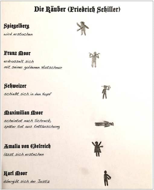 zum Einstieg auf Folie eine Lösung (selbst gestaltet oder vorliegend) zu einem anderen, den Schüler/innen bekannten Werk, z.B. „Faust“ oder „Räuber“ [s.u. Seiten 3, 5; falls Faust/die Räuber im Unterricht bearbeitet werden sollen, sind Seiten 2 und 4 zu verwenden]