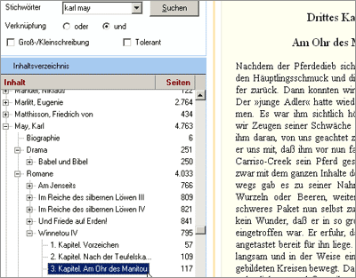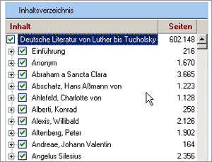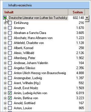 In den meisten Fällen wird man nach einer Kombination aus Autor und Stichwort suchen wollen. Dies ist so einfach nicht möglich, da bei der Eingabe von “schiller geliebte” in die Volltextsuche nach Texten gesucht wird, in denen die Wörter “Schiller” und “Geliebte” vorkommen. Wenn Sie Ihre Suche auf einen Autor bzw. einen Teil oder einen Band seines Werkes einschränken wollen, müssen Sie die Auswahl im Inhaltsverzeichnis auf die gewünschte Kategorie einschränken (z.B. auf “Goethe”, “Goethe -> Dramen” oder “Goethe -> Dramen -> Götz von Berlichingen”). Das machen Sie so: