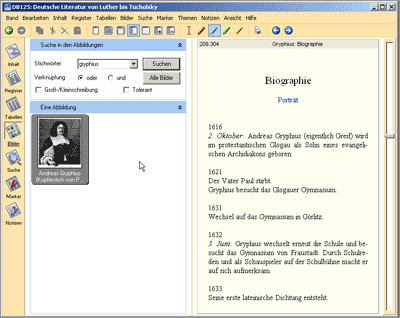 - Ein Bildbrowser; alle vorhandenen Bilder können auch über Schlagworte werden; zu fast jedem Autor ist ein Bild vorhanden. Die Bilder sind von guter Qualität und können ebenfalls unkompliziert verarbeitet werden. Auf einem Apple Mac (10.4.2) konnten wir die Großansichten der Bilder leider nicht aufrufen.