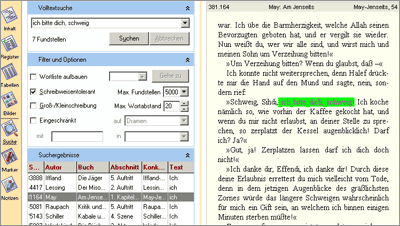 - Die Volltextsuche erlaubt es, nach einzelnen Stichwörtern oder Themen zu suchen. Die Suchfunktion ist komplex (und deshalb auch etwas kompliziert), so dass zu beliebigen Themen Stellen gefunden werden können (z.B. Fortschritt, Liebe usw.)
