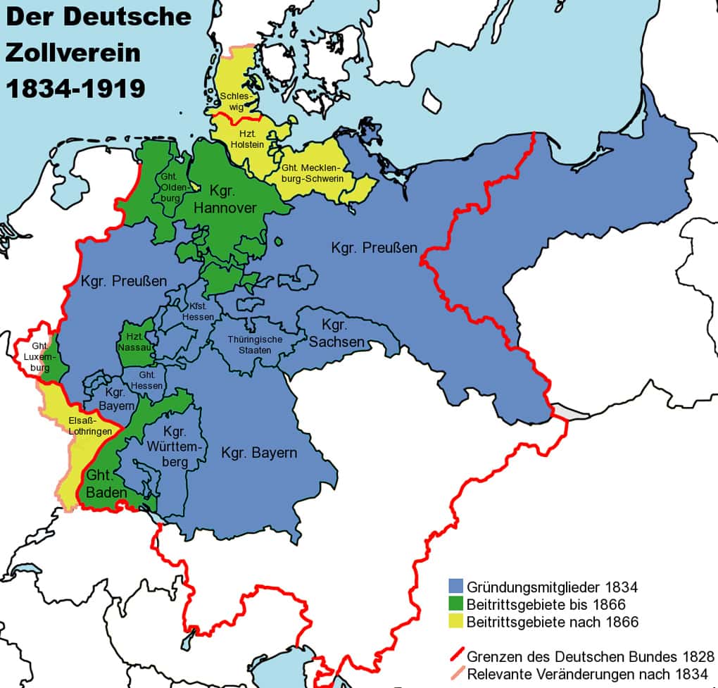 Durch staatliche Maßnahmen wie Gewerbefreiheit, Bauernbefreiung und Unterstützung von Unternehmern wurden diese Hemmnisse abgebaut. Als wichtigste Maßnahme gilt die Einführung des Deutschen Zollvereins im Jahr 1834, wo sich Staaten des Deutschen Bundes unter der Führung Preußens zu einer Handelszone zusammenschlossen, siehe die folgende Karte Pischdi: Der Deutsche Zollverein 1834-1919 (CC BY-SA 3.0).
