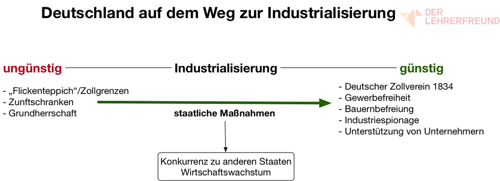 Die Bedingungen für die Industrialisierung waren im Deutschland des 19. Jh. alles andere als ideal. Das Tafelbild zeigt, welche Faktoren ungünstig waren und wie durch staatliche Maßnahmen (z.B. Deutscher Zollverein) eine günstige Situation hergestellt werden konnte, durch die der Prozess der Industrialisierung erst ermöglicht wurde.