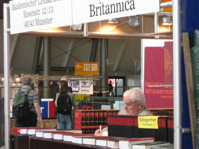 Vorschau: Stand des Akademischen Lexikadienstes mit Brockhaus / Enzyklopädia BritannicaAm Stand “Akademischer Lexikadienst” saß ein sympathischer, weißhaariger Herr inmitten dicker, schweinslederner Ausgaben des Brockhaus und der Enzyklopädia Britannica. Viel war da nicht los. Verständlich: Der vorläufige Schlussbericht (23.02.2008) der Messeleitung hält fest, dass dieses Jahr “die Nachfrage nach Multimedia/Medien [..] stark gewachsen [sei] (30 Prozent, nach 18 Prozent in 2005)”. Außerdem hat die “Microsoft Encarta 2008 Lernen und Wissen” einen der digita 2008-Preise abgeräumt. Dicke Bücher sind nicht mehr gefragt, der gedruckte Brockhaus wird ab Mitte April 2008 durch ein “kostenloses, durch Werbung finanziertes Lexikonportal im Internet” ersetzt.