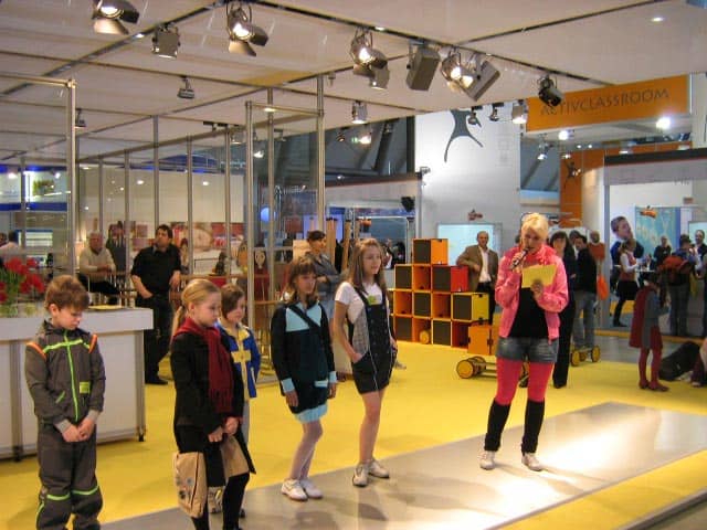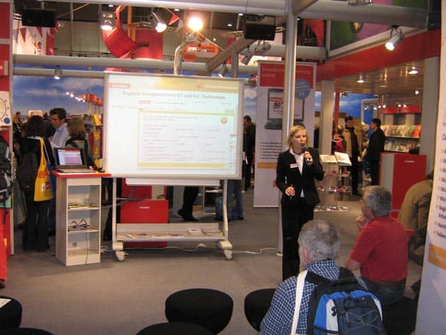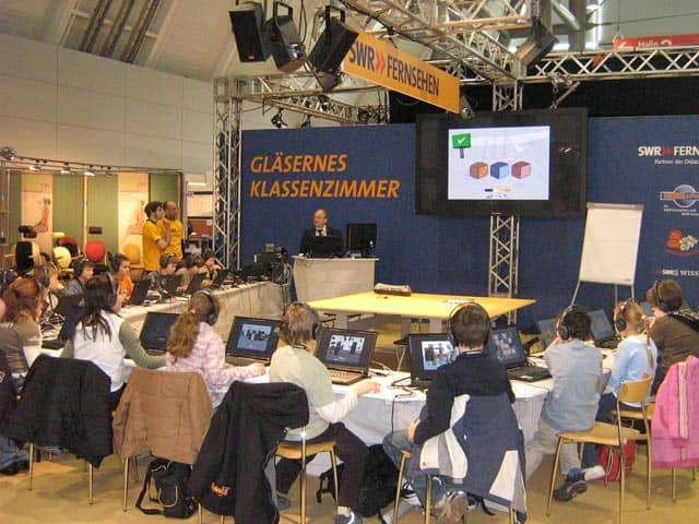 Vorschau: Gläsernes Klassenzimmer des SWR-SchulfernsehensDie Wissensdurstigen konnten verschiedene Vorträge/Diskussionen besuchen, in denen entweder pädagogisch und bildungspolitisch theoretisiert wurde, oder aber auf möglichst dezente Art und Weise Produkte positioniert werden sollten. Die wenigen sehenswerten Ausnahmen wuchsen aus den Schultern gemeinnütziger Vereine oder öffentlich-rechtlicher Fernsehsender. So wurden im “Gläsernen Klassenzimmer” des SWR-Schulfernsehens die ganze Woche hinweg Lehrer/innen fortgebildet und Einsatzmöglichkeiten multimedialer Lernmedien gezeigt.