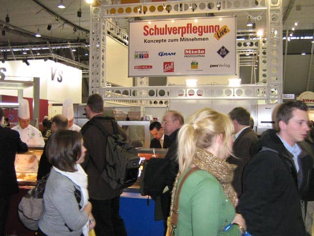 Die Entwicklung zur Ganztagsunterbringung (aka “Ganztagesschule”) war auf der didacta 2008 unter anderem daran zu erkennen, dass mehrere Anbieter von Schulverpflegung ihre Ess- und/oder Trinkwaren präsentierten. Ein Ausstellerkonglomerat baute eine komplette Kantine auf und gab an Passanten kleine, leckere Portiönchen (Reis mit Hühnchen, Gulaschsüppchen etc.) aus - die allerdings nach Aussage eines Kochs mit Glutamaten zubereitet waren. Beim den “nächsten Rezepten” würde sich das aber ändern, beeilte er sich auf unser skeptisches Stirnrunzeln hin zu versichern.