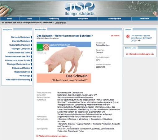 Nun ist es nicht nur eine Schande, dass die Menschen solche Bestialitäten begehen und tolerieren. Es ist auch eine Schande, dass der offizielle Thüringer Bildungsserver solche PR-Materialien der Lobby einstellt und dadurch Lehrer/innen zur Behandlung im Unterricht empfiehlt. Schauen wir uns noch etwas auf dem Schulportal Thüringen um, da findet man dann zum Beispiel: