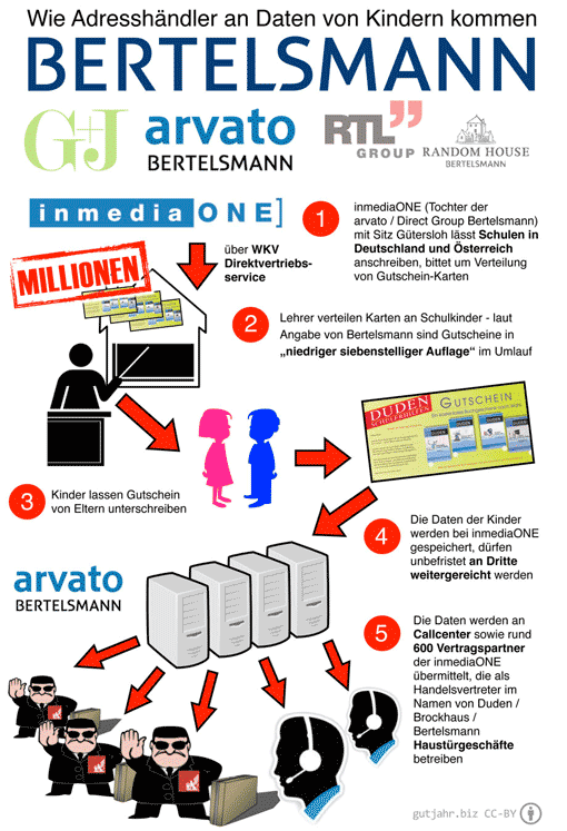 Der Bertelsmann-Konzern (bzw. seine Tochter inmediaONE) sammelt gezielt Daten von Minderjährigen, indem Gutscheine (z.B. Duden) in Schulen verteilt werden; der Kinder-Brockhaus wird ebenfalls gezielt beworben. Die persönlichen Daten der Kinder werden anschließend systematisiert und weiterverwertet.