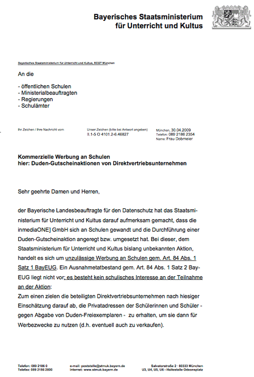 [Bei der Duden-Gutscheinaktion] handelt es sich um unzulässige Werbung an Schulen gem. Art. 84 Abs. 1 Satz 1 BayEUG. [...]