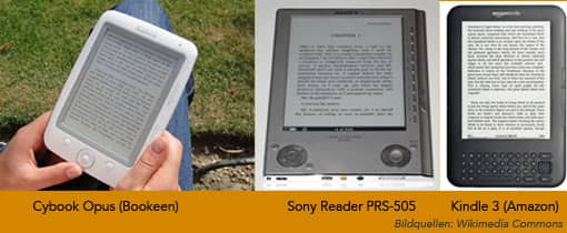 E-Books werden in unterschiedlichen Formaten verkauft und in Umlauf gebracht. Immer mehr Personen besitzen ein Gerät, mit dem sie E-Books lesen können. Tablets (wie das iPad) oder Smartphones können als E-Book-Reader dienen und viele E-Book-Formate anzeigen, ebenso natürlich ungemütlich der herkömmliche Desktop-PC. Dann gibt es reine E-Book-Reader wie den Amazon Kindle oder die PRS-Reihe von Sony. Sie unterscheiden sich von Allround-Geräten dadurch, dass sie eine Technologie benutzen, die sich "elektronisches Papier" (auch "E-Paper" oder "E-Ink") nennt. Die Anzeige beim elektronischen Papier ist gestochen scharf, der Stromverbrauch minimal. Reine E-Book-Reader sind aufgrund ihrer eingeschränkten Funktionalität auch entsprechend handlich.