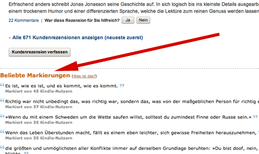 Und tatsächlich findet sich im Amazon-Online-Shop bei vielen E-Books (v.a. aus dem Bereich Belletristik) unter den Leserkommentaren ein Bereich "Beliebte Markierungen", hier ein Screenshot von der Produktseite zum Buch Der Hundertjährige, der aus dem Fenster stieg und verschwand. Demnach haben 45 Kindle-Nutzer/innen die Stelle "Es ist, wie es ist, und es kommt, wie es kommt." markiert. Naja.