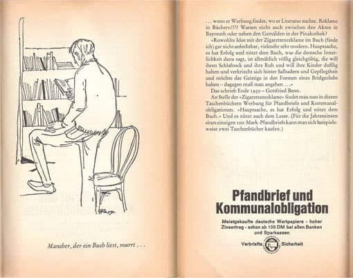 Das ist nicht neu, in den 1950ern bis in die 1990er gab es das ja schon einmal: Da war bspw. in vielen Büchern des Rowohlt-Verlags eine Doppelseite mit Werbung eingebaut - man erinnert sich vor allem an "Pfandbrief und Kommunalobligation". Oft war die Werbung kontextsensitiv, d.h. sie bezog sich auf den Inhalt des Buches. Beispiel (flickr):