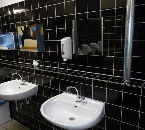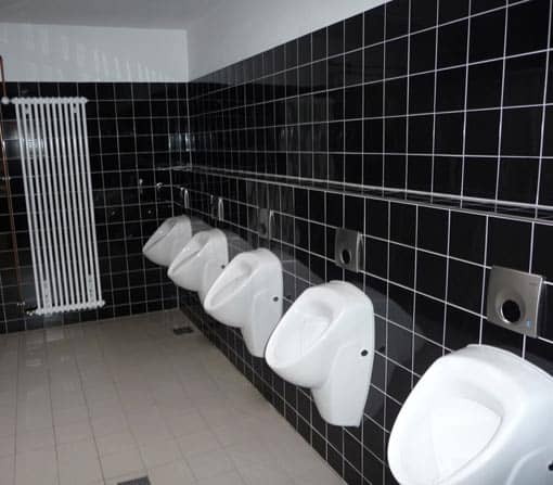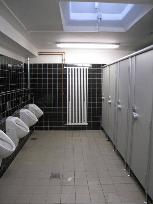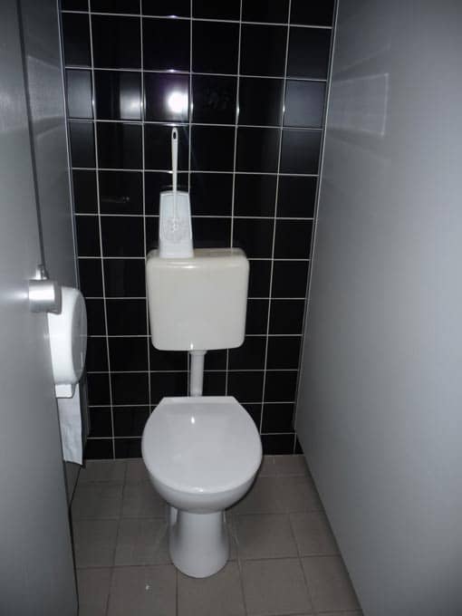 Als die Sanierung des Werkstattgebäudes anstand, wo die meisten Beschädigungen und Verunreinigen waren, kamen wir auf eine schlichte und dennoch bestechende Idee: Die Wände wurden mit schwarzen glänzenden Fliesen versehen, die Türen und Trennwände in edlem silbergrau ausgeführt. Das Ganze sieht richtig edel aus, wie in einem Hotel. Und siehe da: seit nunmehr 7 Jahren sind die Toiletten in diesem (edlen) Zustand geblieben. Sie können jederzeit in Dieburg besichtigt werden.