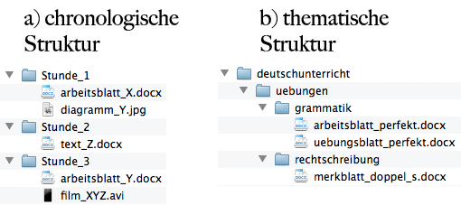 Solche Verzeichnisstrukturen können sich bspw. am Unterrichtsverlauf orientieren oder an einer thematischen Gliederung (vgl. Lehrerfreund 27.01.2009: Organisation von Unterrichtsmaterialien auf der Festplatte - Verzeichnisstruktur):