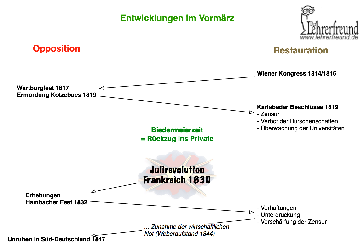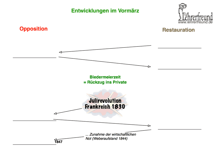 Auf diesem Tafelbild sind die wesentlichen Aktionen und Reaktionen von Opposition und Restauration dargestellt; die Entwicklung vom Wiener Kongress 1815 bis zu den ersten Unruhen in Süd-Deutschland werden deutlich. Variante des Tafelbilds als Arbeitsblatt mit Lücken.