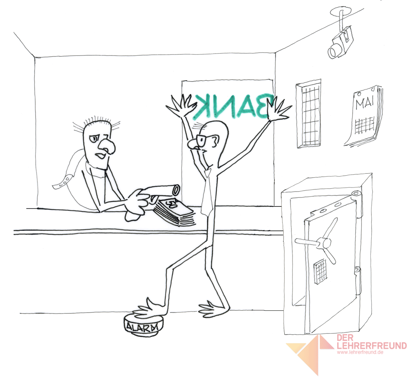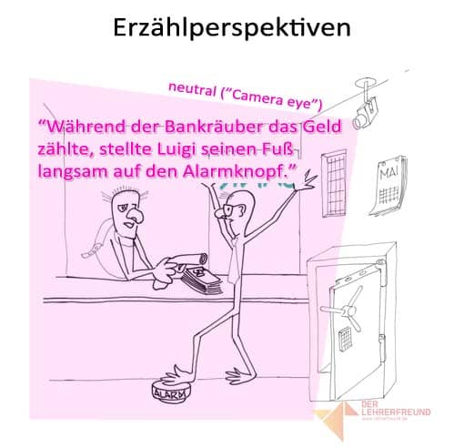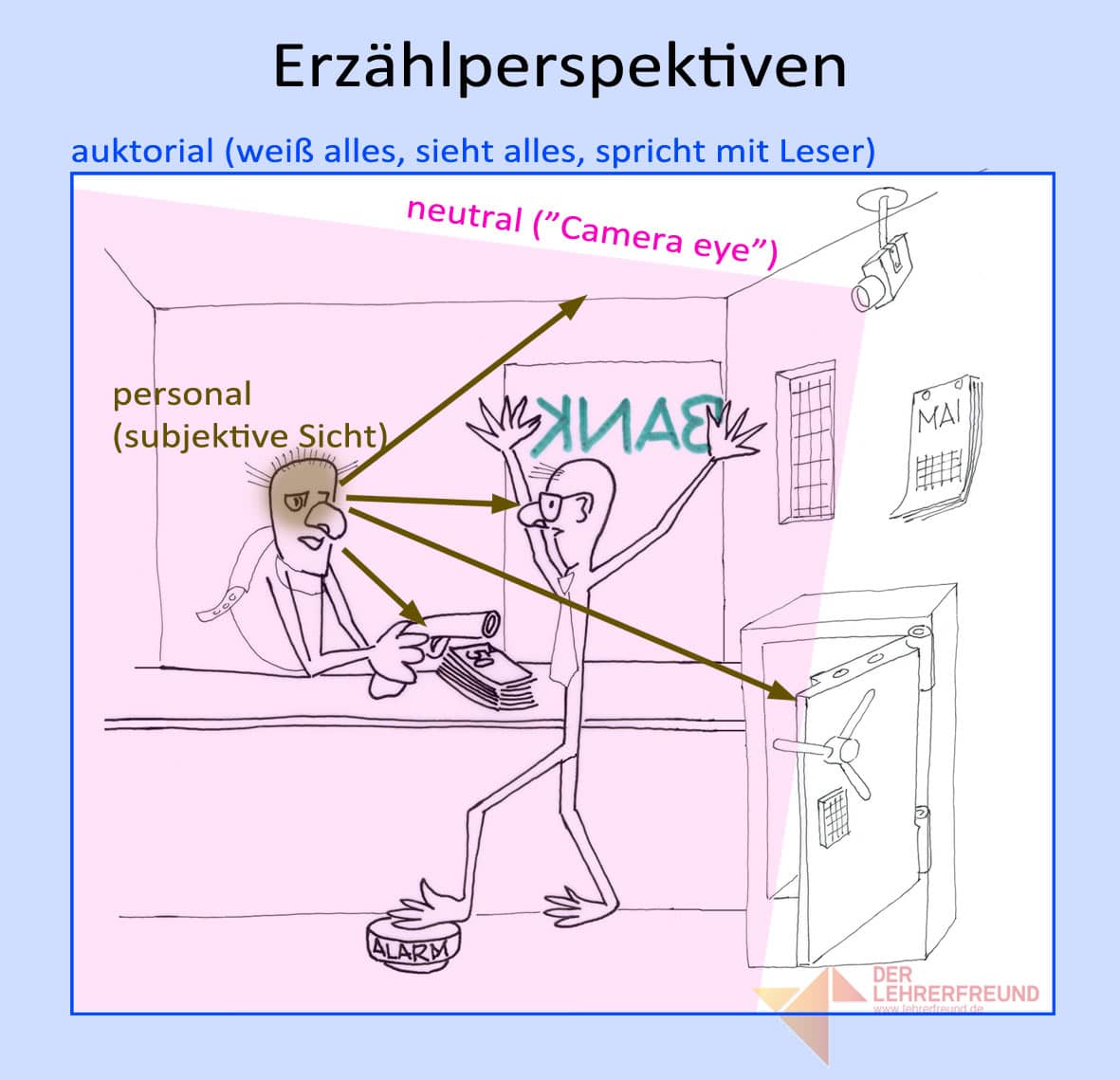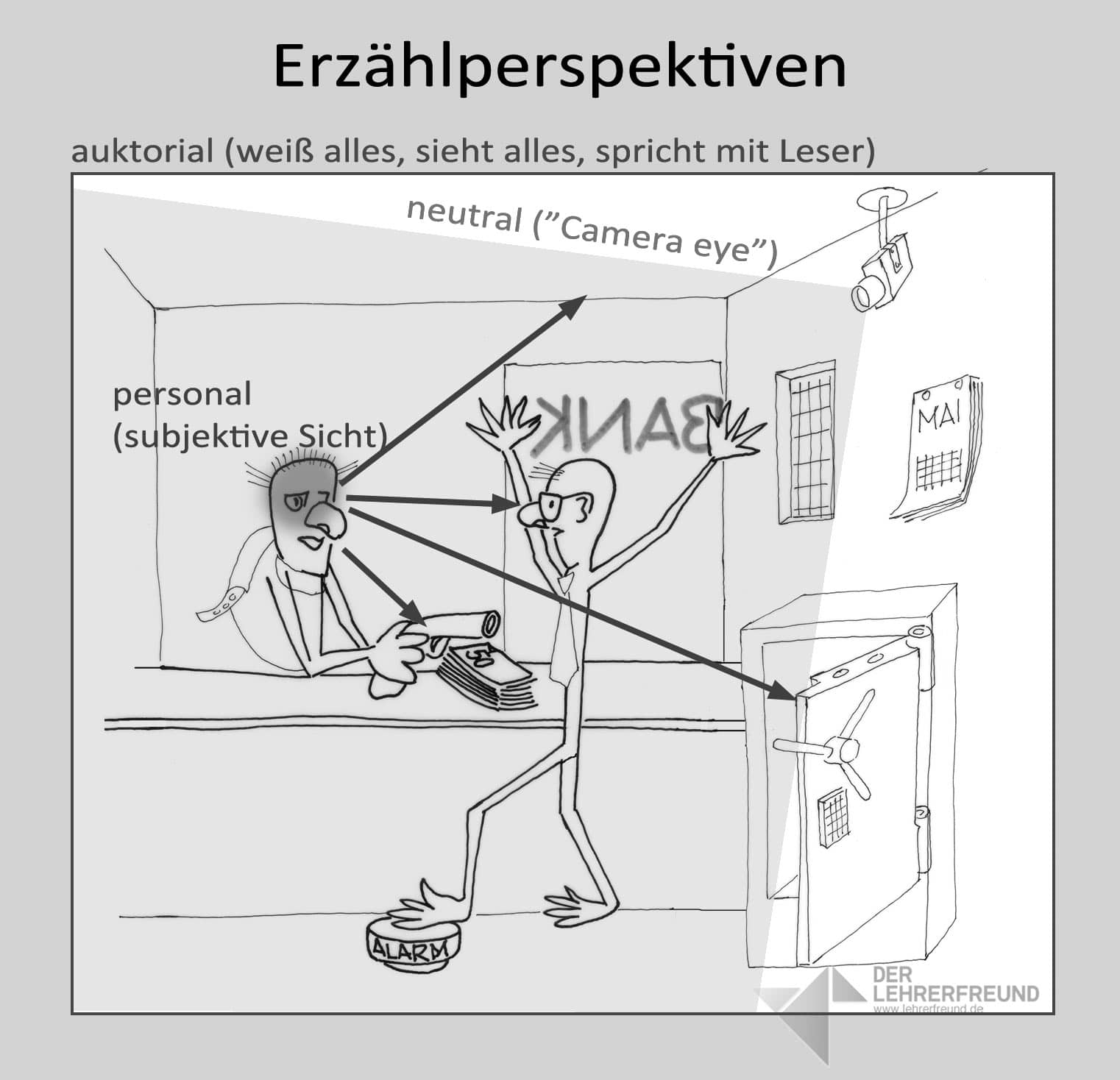 Die Erzählperspektiven werden am Beispiel eines Bankraubs beschrieben. Die Zeichnung kann an der Tafel als Tafelbild entwickelt oder als Folie aufgelegt werden.
